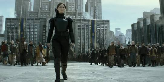 O plot político já não é tão presente como deveria aqui. Se a parte 1 focou na propaganda como instrumento de guerra, Jogos Vorazes introduziu esse universo corrupto e ditatorial e Em Chamas elevou a mensagem ao máximo beirando a perfeição, aqui esse pano de fundo, apesar de permear toda a guerra, é mostrado com tudo mais pro final, especialmente nas cenas com o Presidente Snow, de uma maneira não tão bem montada.